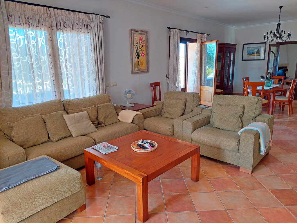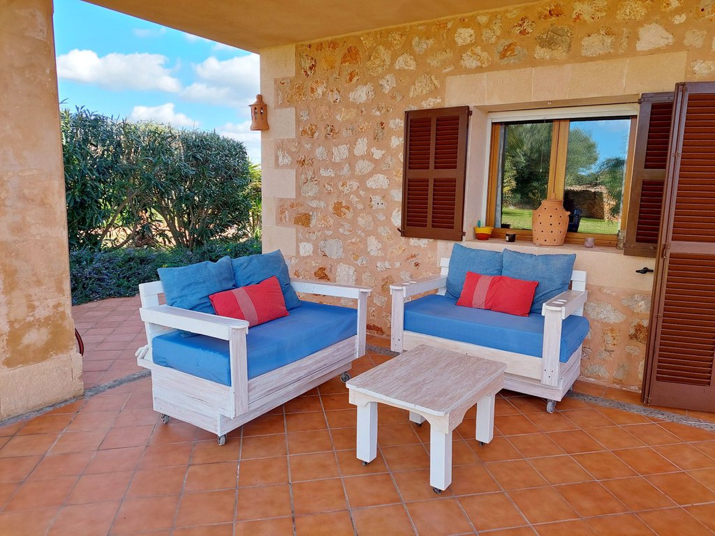 Die sehr gut ausgestattete Finca mit romantischem Panoramablick bis nach Cabrera liegt zwischen Es Llombards und Ses Salines in der Nähe des 'botanicactus' und bietet mit ihrer wohltuenden ruhigen Lage, jedoch der Zentrumsnähe zu Ses Salines und der Nähe zu diversen Stränden einen optimalen Mix zwischen Erholung und abwechslungsreichen Unternehmungen. Auf 250 qm Wohnfläche ist ein malerisches, romantisches Paradies entstanden, in der bis zu 8 Personen den Alltag hinter sich lassen können. Nach einem langen Tag am Meer oder Insel-Sightseeing können Sie im geräumigen Wohnzimmer bei einem Roman oder einem guten Film entspannen (Sat-TV/DVD vorhanden) oder über W-LAN Ihre Erlebnisse mit den Daheimgebliebenen teilen. Wenn Sie gerne kochen, werden Sie dies in der komplett ausgestatteten Küche genießen. Von der Spülmaschine bis zur Kaffeemaschine ist alles vorhanden, was Ihnen den Aufenthalt angenehmer macht. Außerdem steht zusätzlich eine Vorratskammer mit großem Gefrierschrank zur Verfügung. 4 Schlafzimmer zzgl. 3 Bäder und einem Ankleidezimmer sorgen für ausreichend Privatsphäre. Im unteren Bereich gibt es 1 Schlafzimmer plus Bad. Im Obergeschoss 3 Schlafzimmer plus 2 Bäder (eines davon 'en suite').